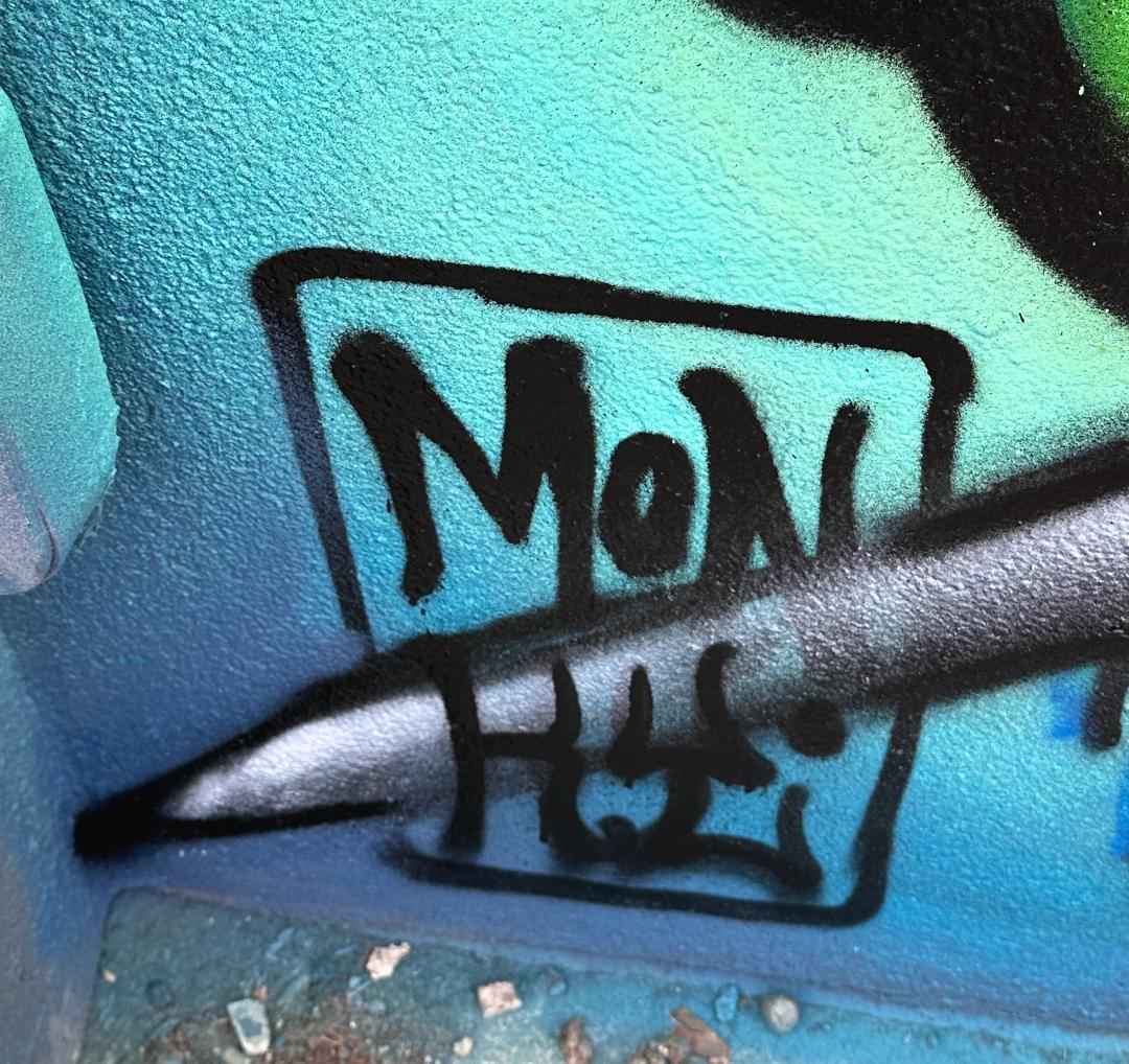 Of all the graf tagged onto the wall, all I wanted was the April Showers face. The best I could do in a 2 foot slot was some demented up angles and truck window reflections.