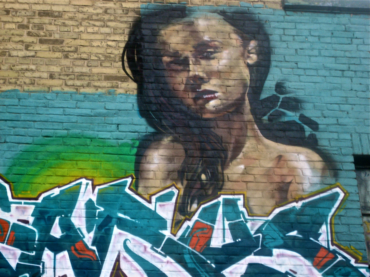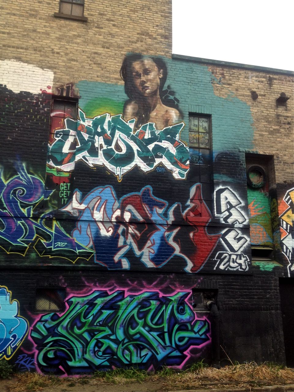 When I reached Higgins Avenue, I turned and captured the paintings from the other angle. Looking the other way down the alley, it’s another wanton view!