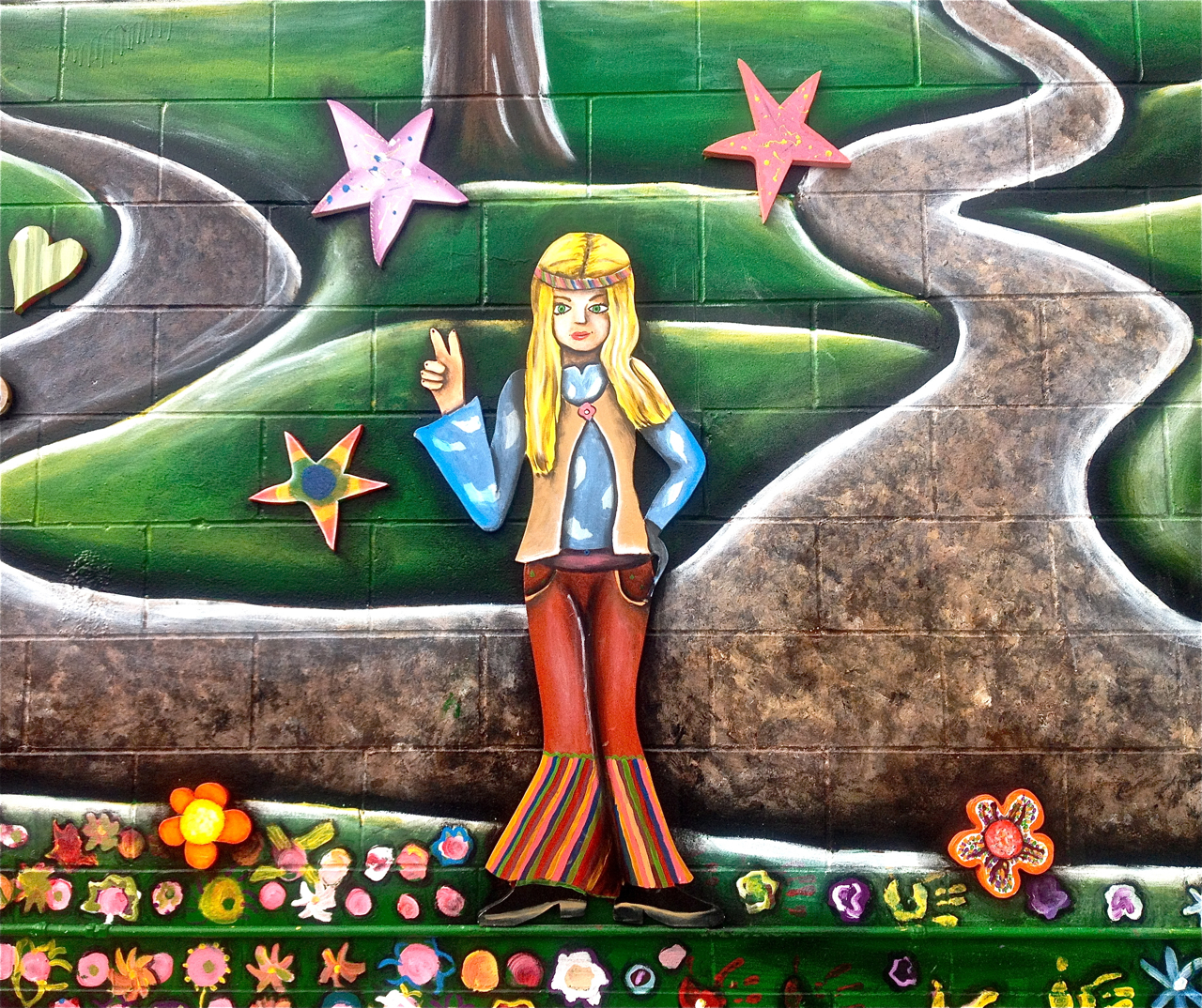 Two sides of the building have been painted into one mural. I started at the street side of the building and made a Slideshow around into the parking lot. The pretty hippie under my text is the final shot of the sequence.