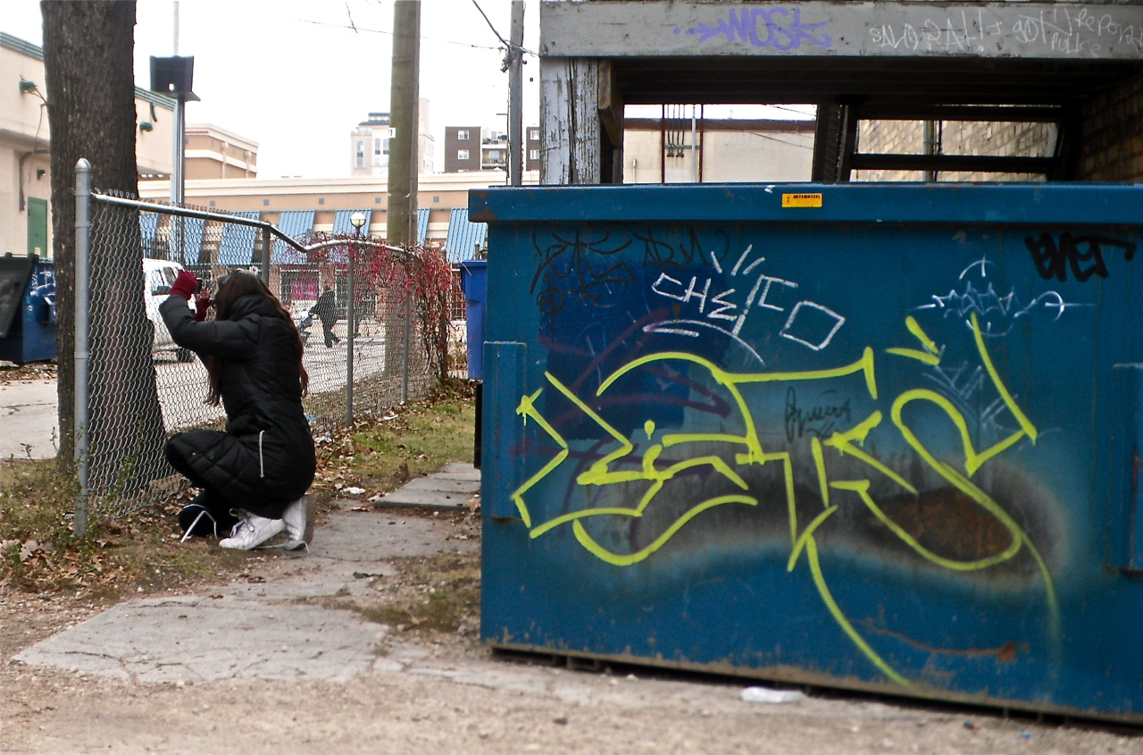 I was in the lane behind 445 River Avenue in Winnipeg. I was shooting the centered piece of Graffiti Art, but when I saw a giant bug I ran for cover.