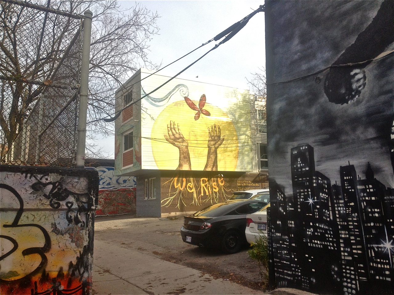 We Rise is part of the collection of art in the heavily Graffiti Art endowed alley that runs along the subway line between Dundas St. W. and Keele.
