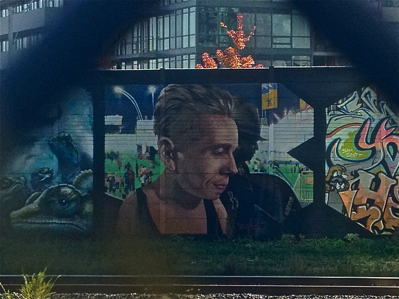 TWO – The view directly across the rails from ONE, which is Graffiti not commissioned by the city, but may be paid for the the private property it graces.