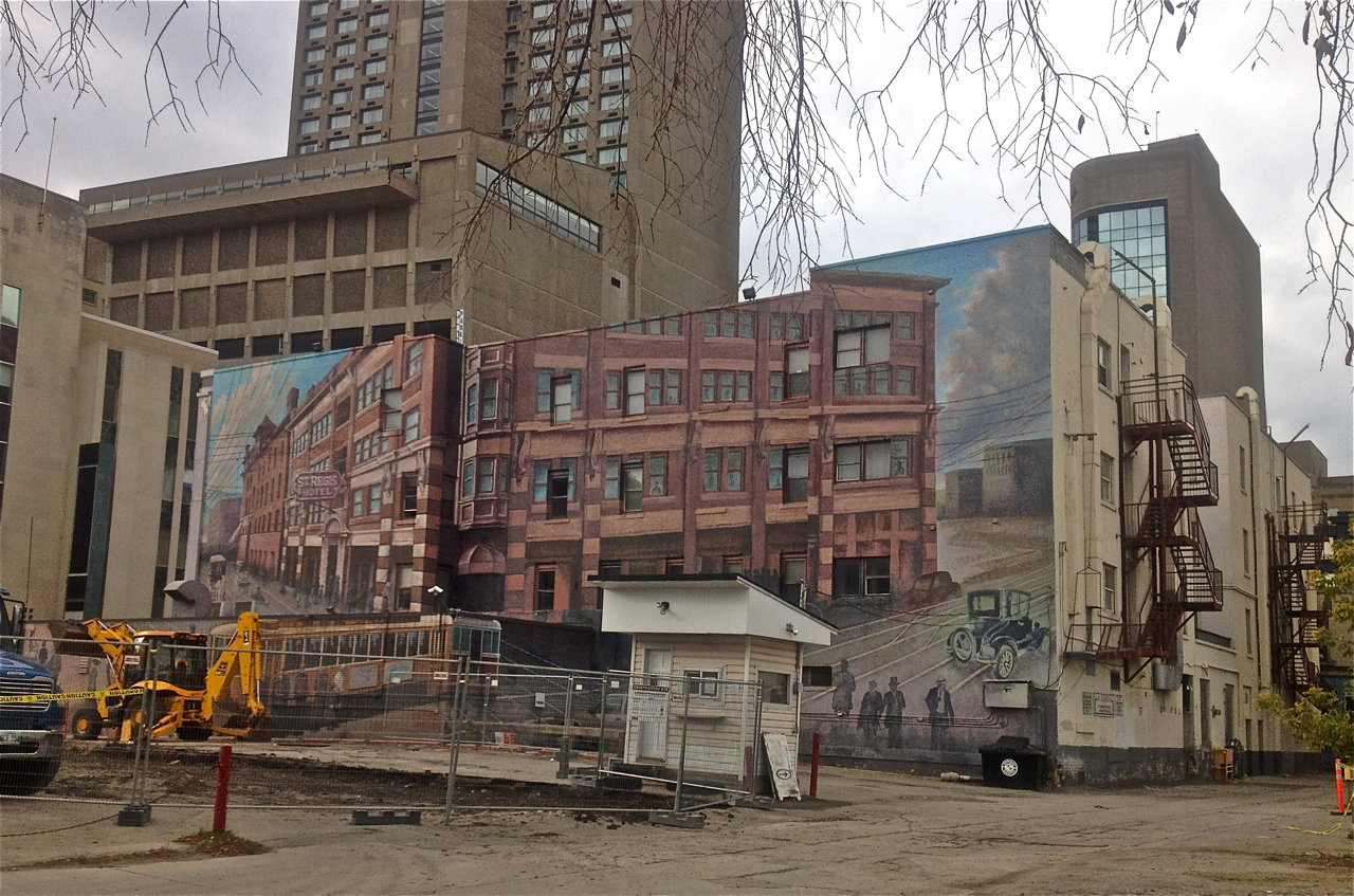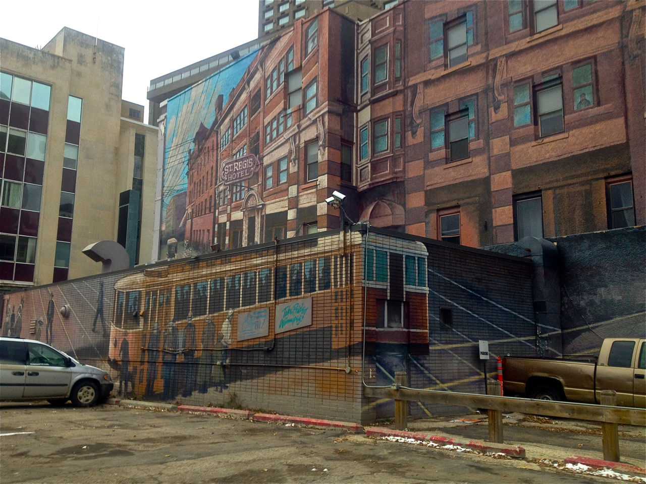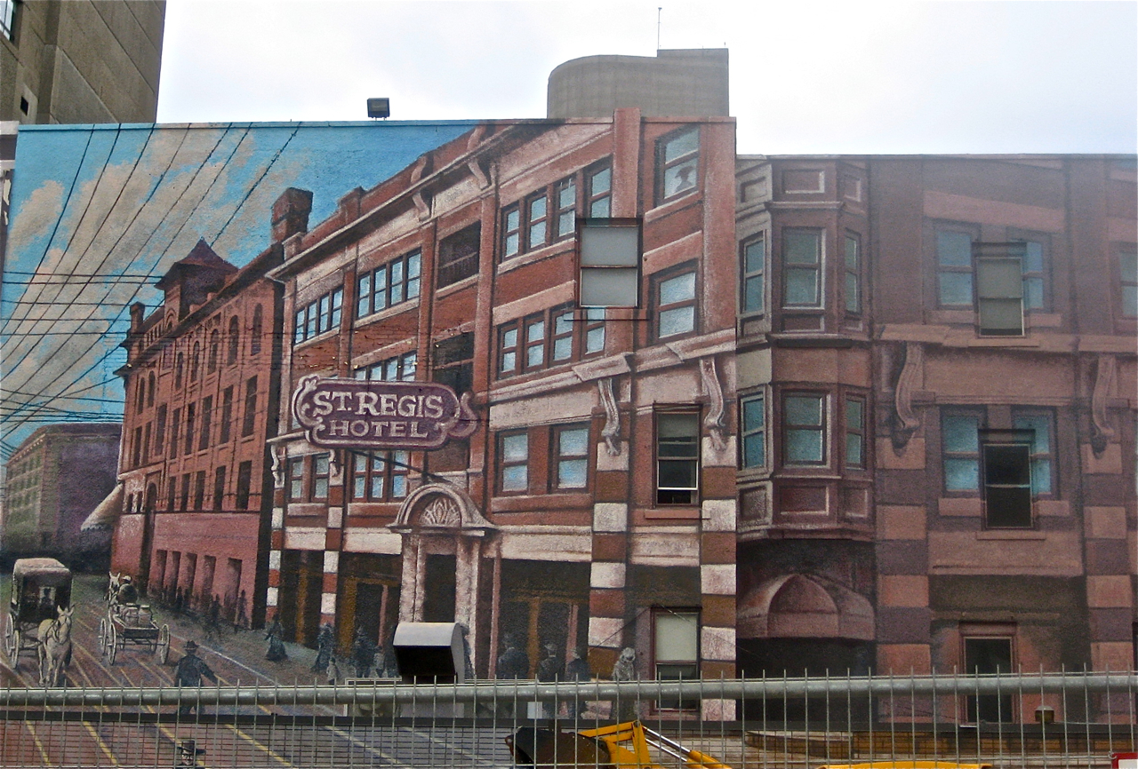 I suddenly realized it was the horizon. I used my zoom, and reeled the area in. It was a building painted on a building, The St. Regis Hotel – 1911. The sky line was insane.