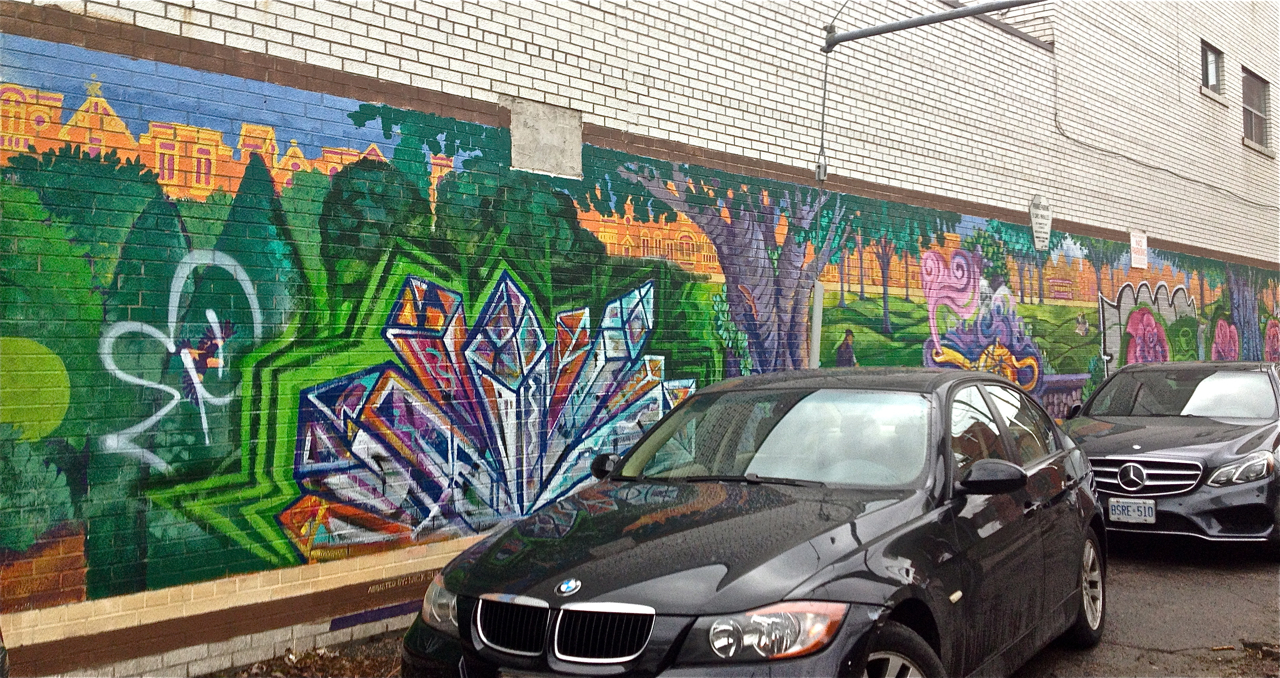 Lousy taggers scribblers with no street cred, respect or chops have all but completely ruined this charming mural .
