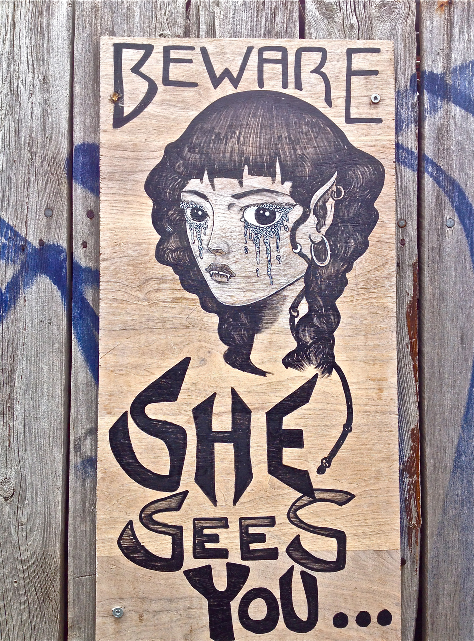 In the alley just North of Queen W. between Ossington and Gladstone, I found this sweet face trying to be scary.
