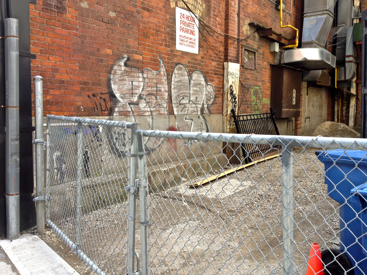 After reading Jacqueline’s book, I did some research. Banksy had been (unofficially) in Toronto in 2010. Sadly only 1 of 7 pieces remains, and it’s in this gated private parking.
