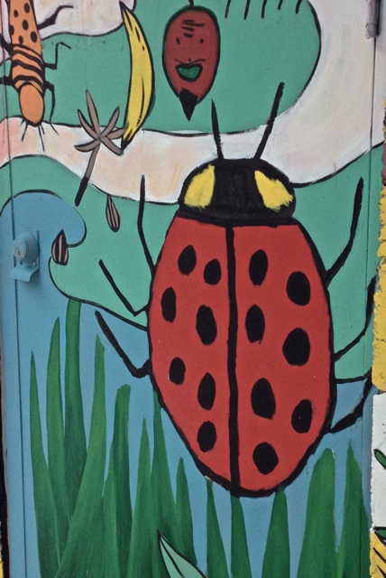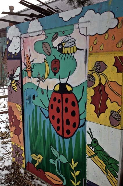 Below, this one side of the shed seems painted by an older artist. A teen? A parent?