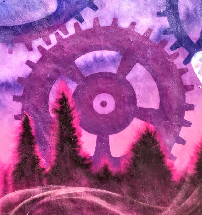 Immediately thereupon, I wondered why the artist had a clock set at 11:00, & gears in the mural with the bees?