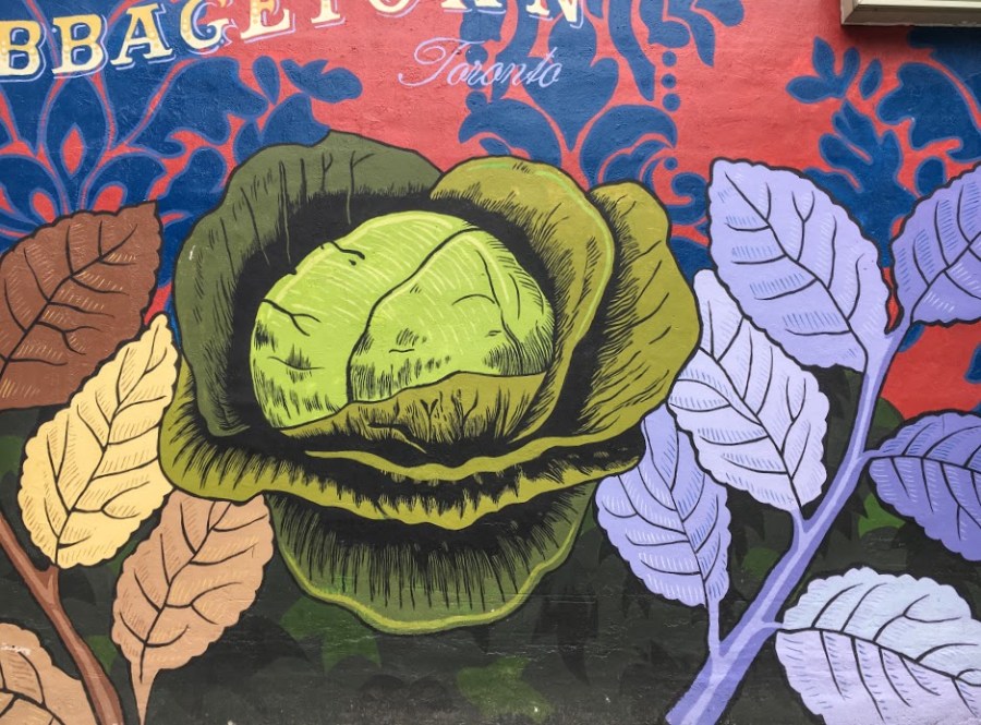 A cabbage head has so many layers — the artist did an admirable job of portraying all the layers and shadows. And the mural is so colorful, bright, and lively.
