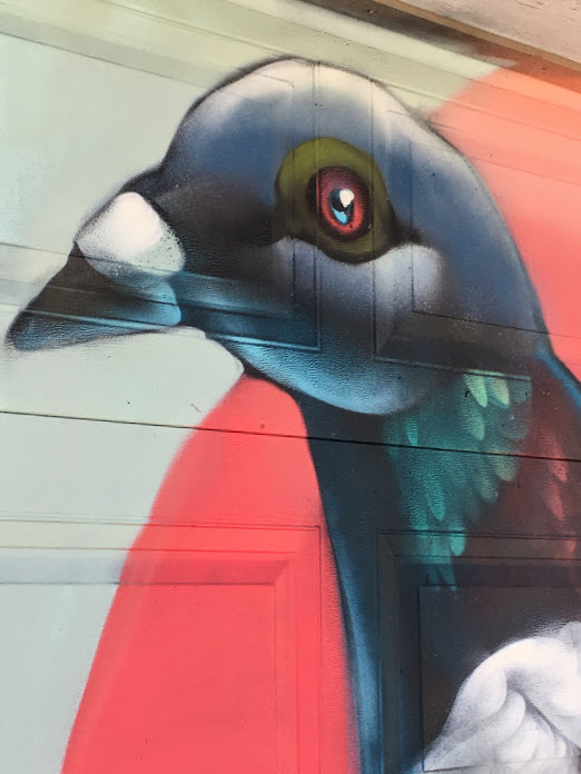 How very lovely this is, Resa, your words, feelings, descriptions. And the pigeon mural is stunning. The artist was able to capture the iridescence and the soft beauty of a pigeon. I like the extra touch of the big red orb (setting sun?), I think it adds definition and warmth to the whole art piece.