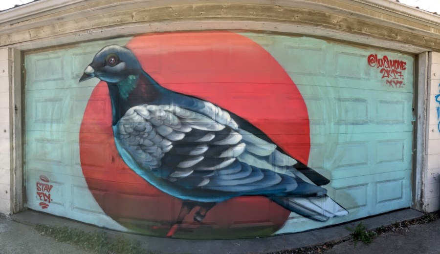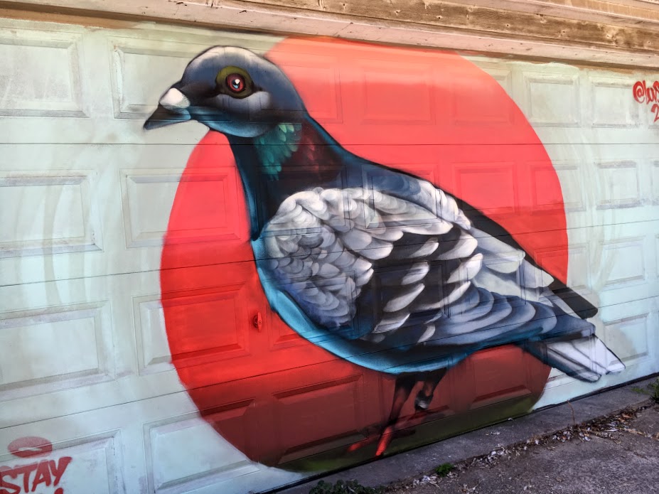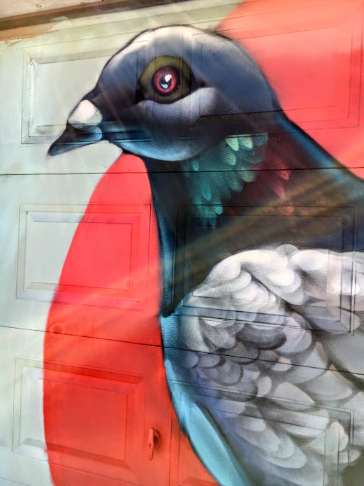It’s amazing what an artist can do on a garage door! I agree about the red sun, it sets the pigeon up quite nicely.