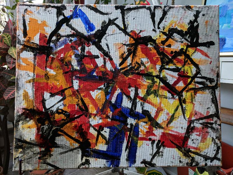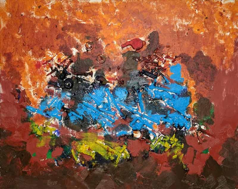 Vernon told me, “this painting is based on a construction site’s nails, screws, black nails, rot & climaxes in rust. All colors represent something at a construction site.