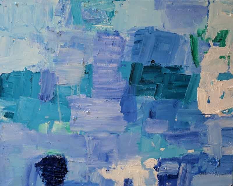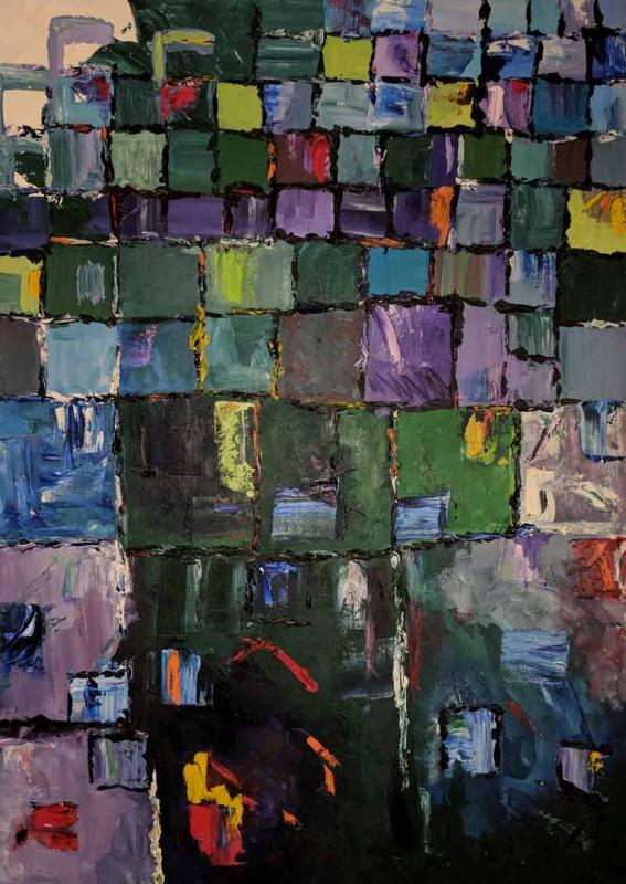 There are lots of colors in the above painting, “Tenements”. I asked Vernon how he knows which tube of paint is what color?