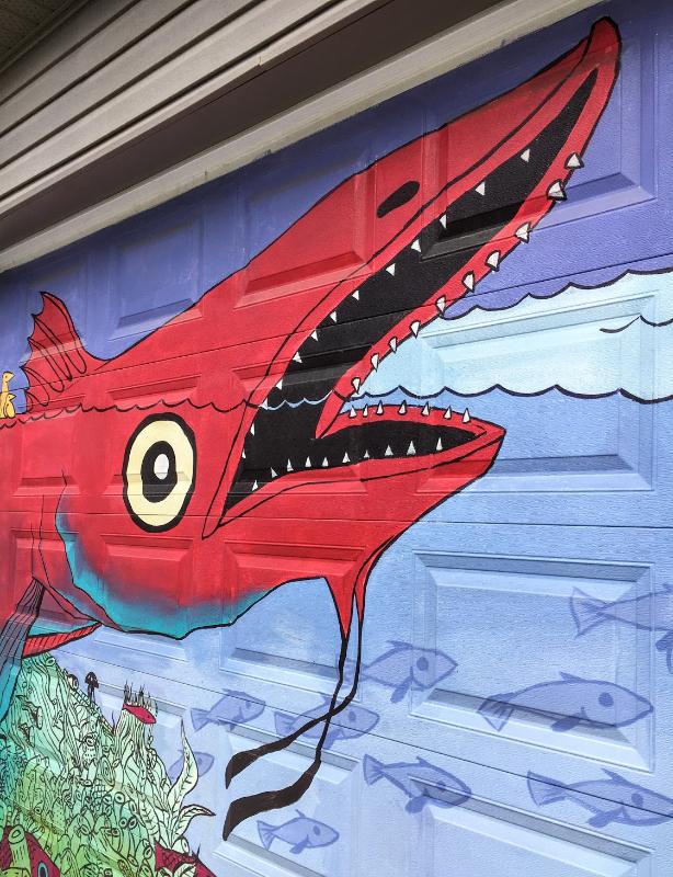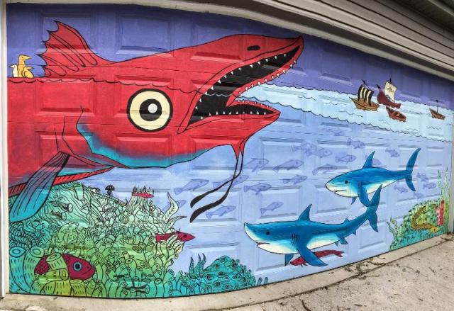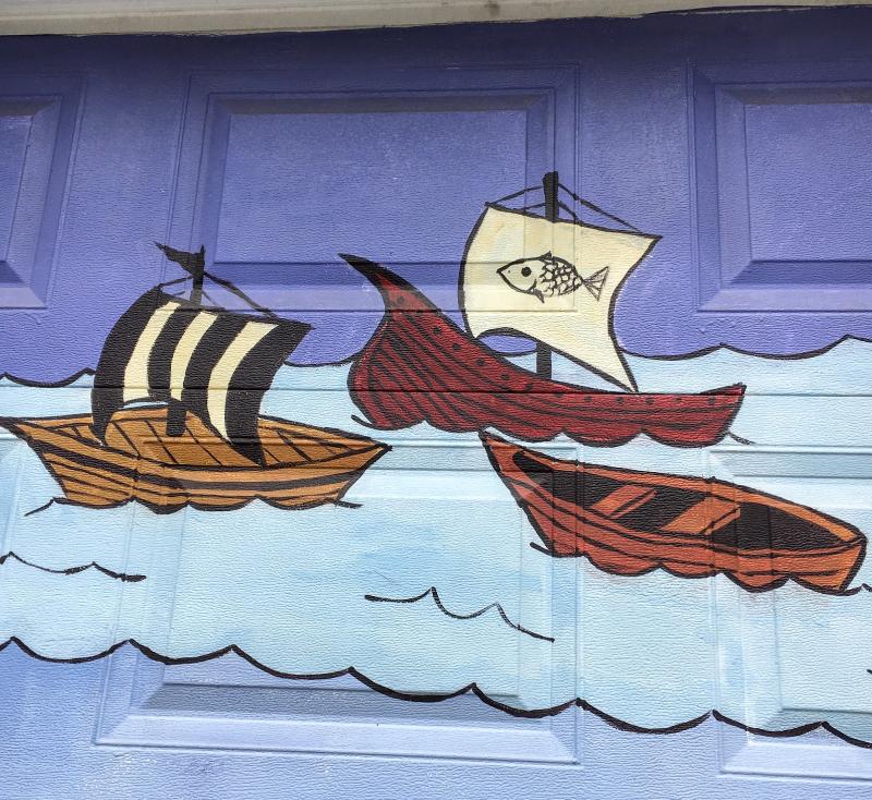 I love the water and sharks, with the coral and seaweed adding to the scene. I liked the ships, too. Nice addition to your murals, Resa.
