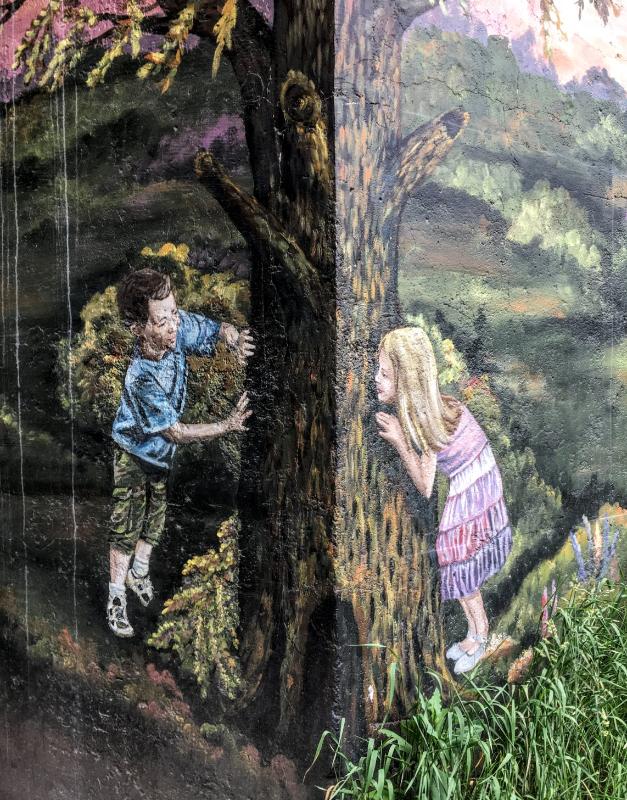 Playing beside the house, and peeking around a tree are 2 children. The tree is on a corner of the underpass. the boy is on one side.