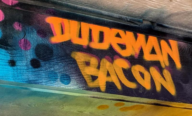 I’m sure Dudeman has painted the skulls and daisy-like flowers, and Bacon has painted the rose, peony and peacock feather. However, Dudeman may have painted this diaphanous beauty.