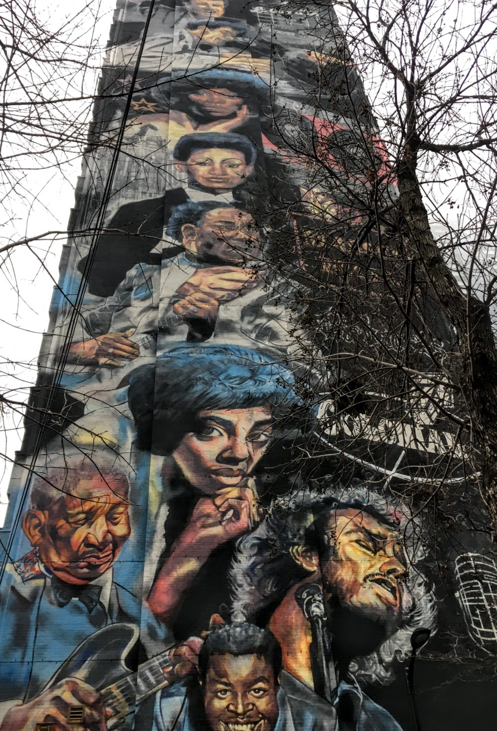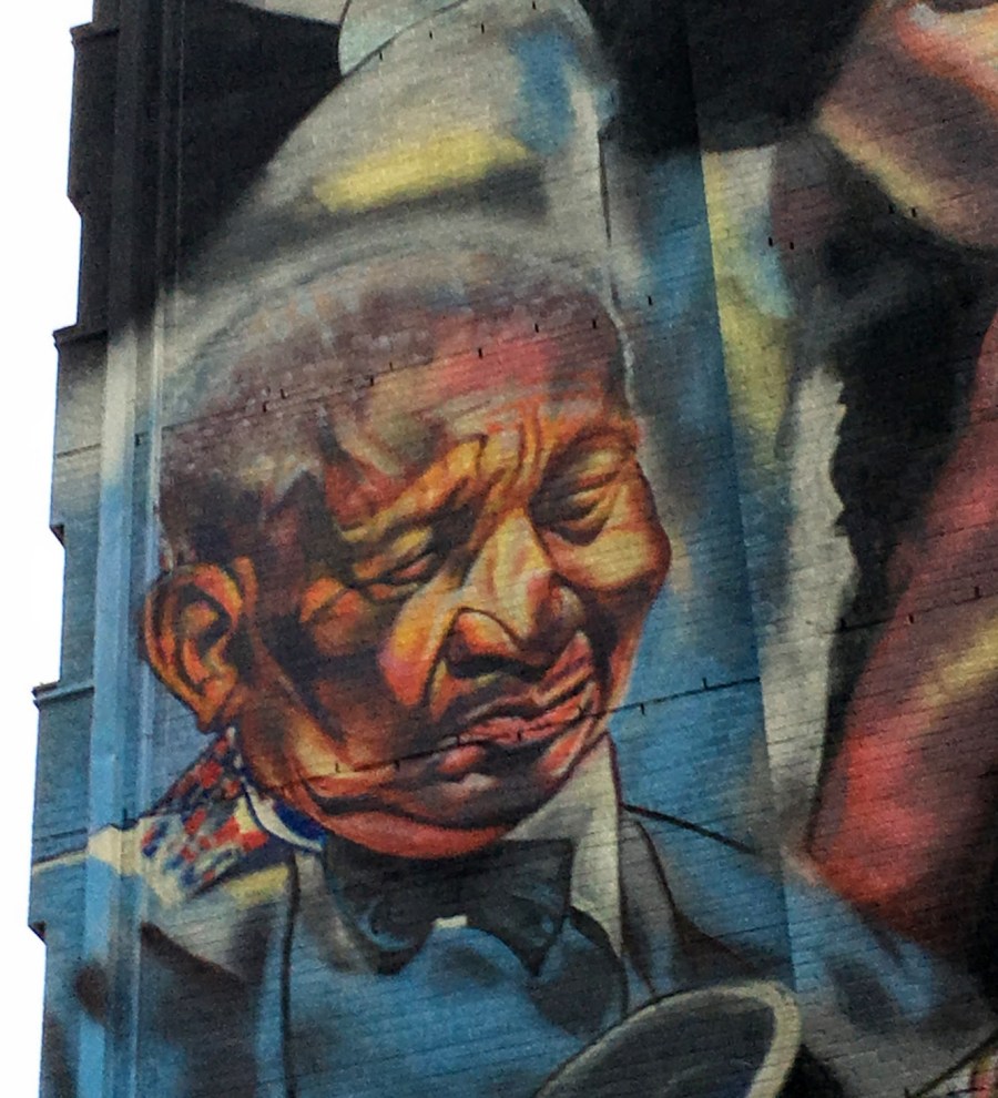 It was impossible for me to capture images that are 22 stories high, but I made a stab at it. To the left, and above Oscar, we have B.B. King, who played a lot at The Colonial (a long gone fave spot for blues and jazz)