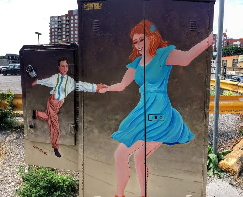 This is totally fun! I love the way the artist made the art fit the boxes. It makes for an interesting perspective of the large woman dancing with a tiny man. 🙂