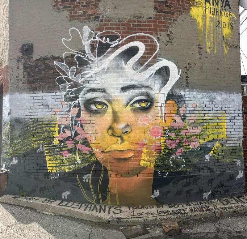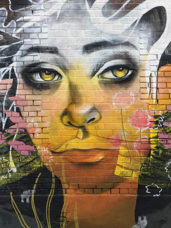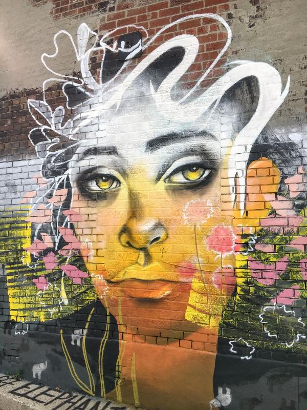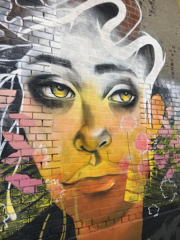 I was thrilled to find this in an alley of painted garage doors. There was one other wall piece, but this one caught my breath. The style is very modern and very street. The message is a bonus. Much of the art is pretty to look at, but messages are hard come by these days.