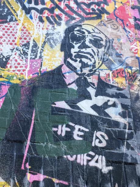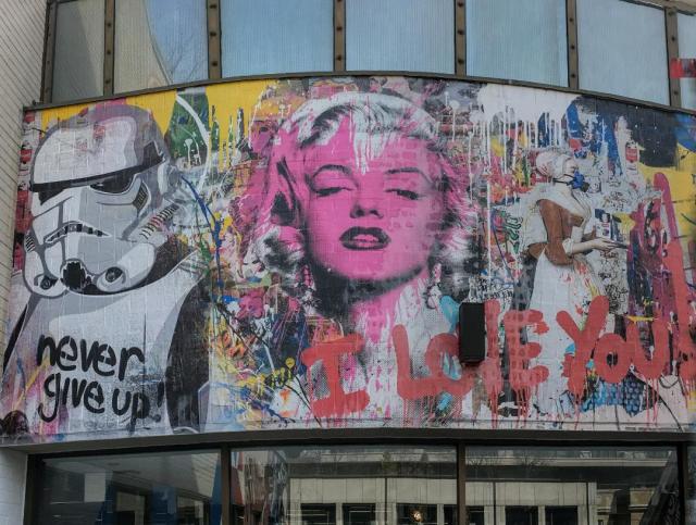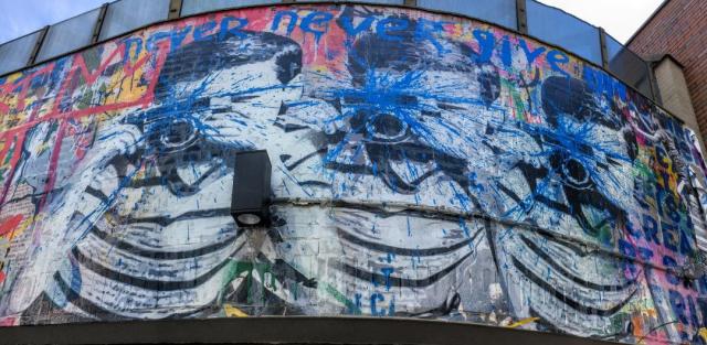 I love this, so full of life and pop culture. I am glad an above commentor knew who the mystery woman was, I couldn’t think of her name despite her being very familiar. Kate Moss should have been easy to remember. There is so much going on in this mural that it must be a pleasure for those who walk past on their way to work.