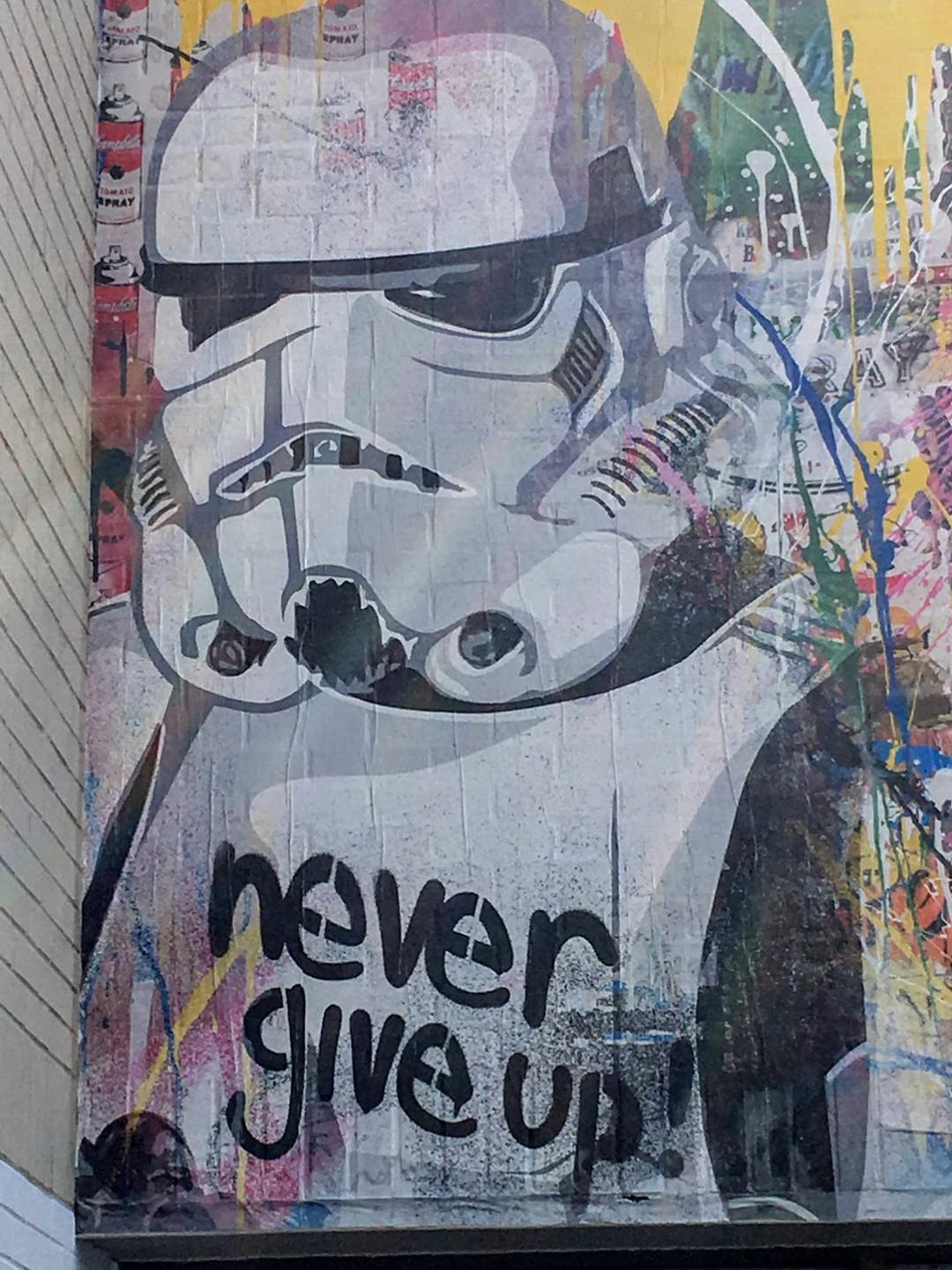 Hi Resa, another fabulous artwork and a really interesting choice of icons and the different pics of them blended together. I find it sort of poetic in a way that as you progress along and view the earlier parts (I assume they are earlier) that they are peeling off as if showing the age of the mural. And as a fully fledged Jedi I can say that the Star Wars Stormtrooper is very lifelike…I have met a few on my adventures! Thanks for sharing.
