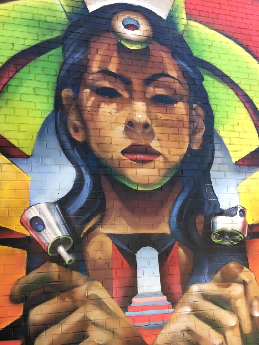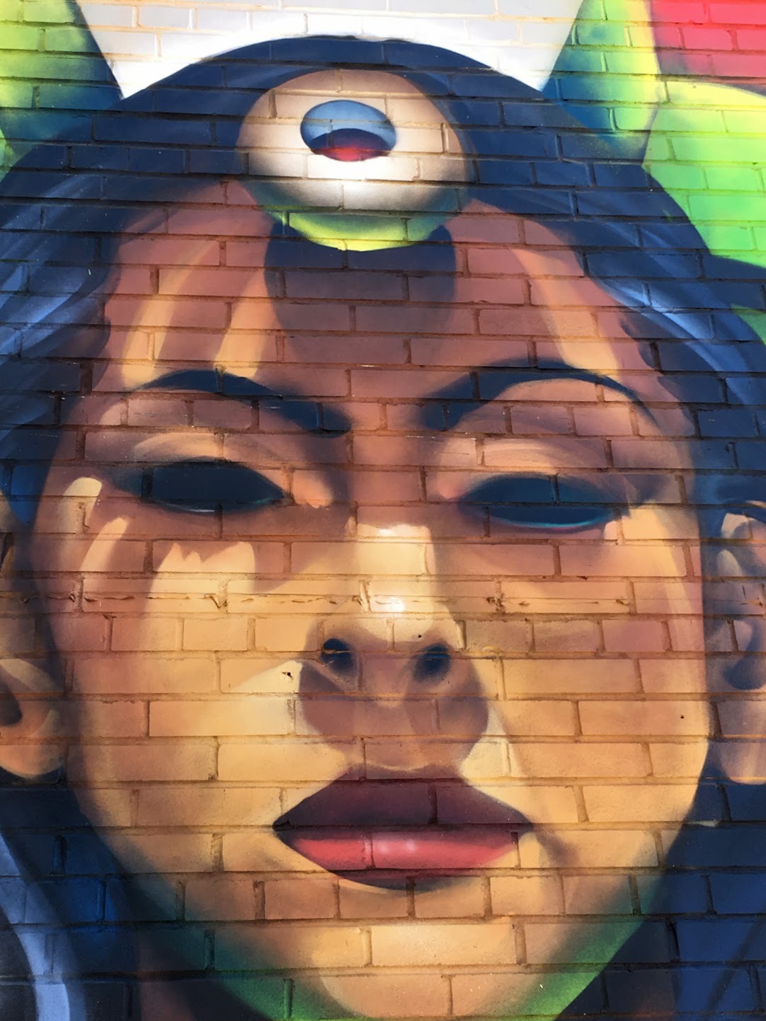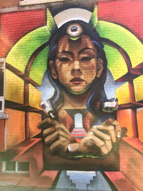 Recently, I bumped into the mural on Instagram. I followed the links, and it turns out it is a graffiti remix of Dali’s painting of “Madonna of Port Lligat”.