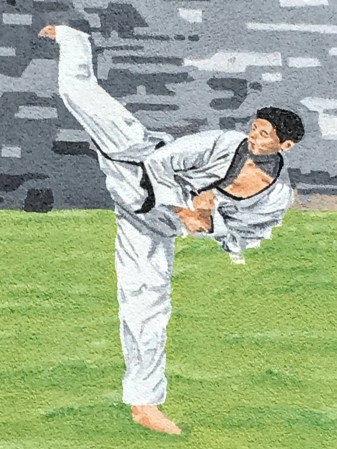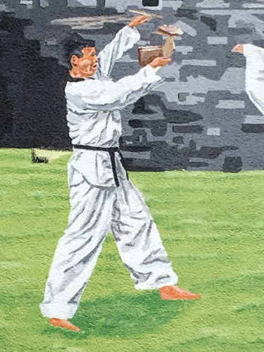 Like the karate dude in the mural breaking a brick or board with a side kick.
