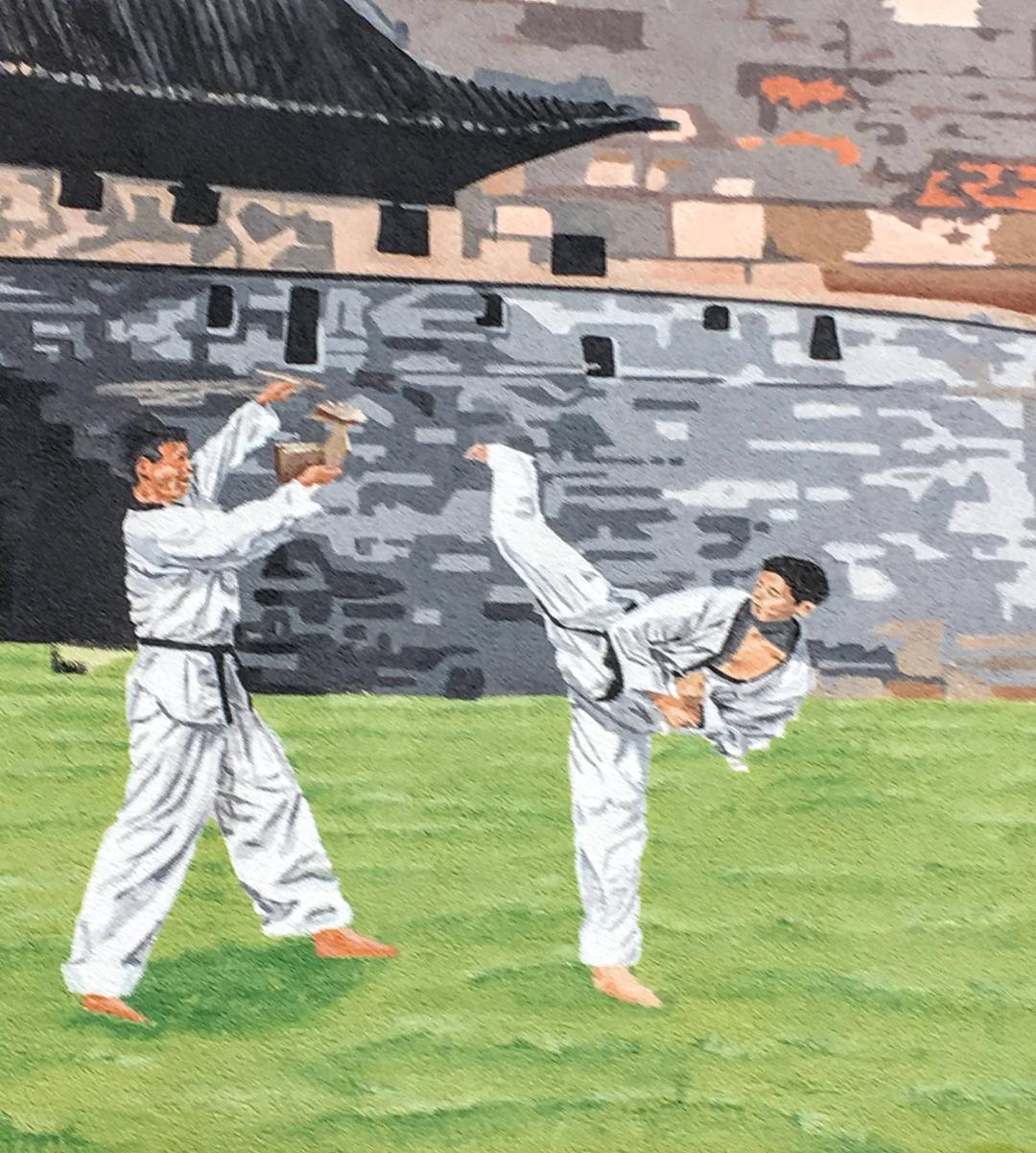 Like the karate dude in the mural breaking a brick or board with a side kick.
