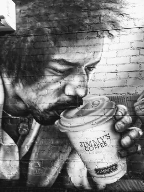 Obviously this mural is advertising Jimmy’s Coffee. Jimmy’s Coffee is a local Toronto business that began in 2009. It has several outlets now.