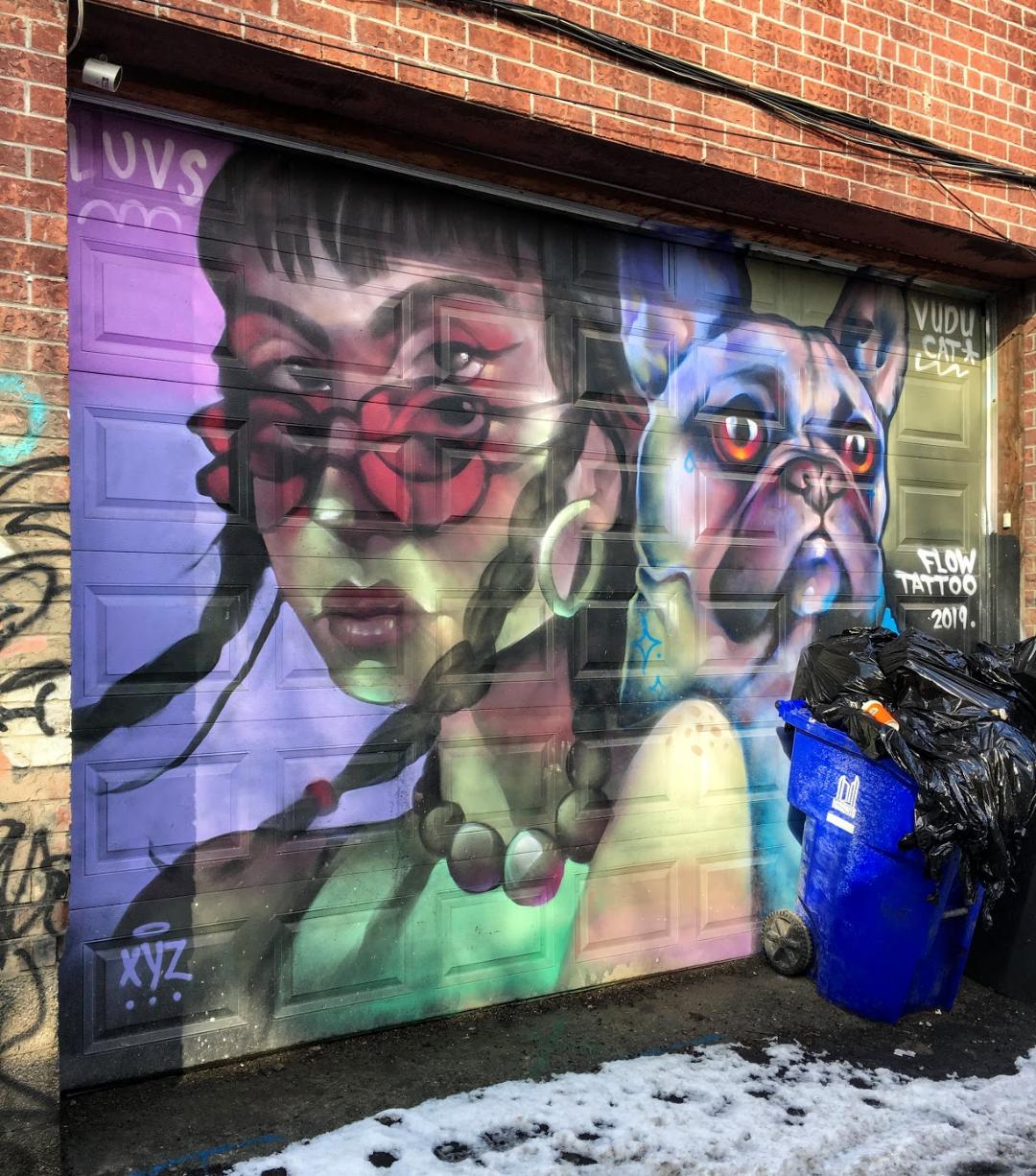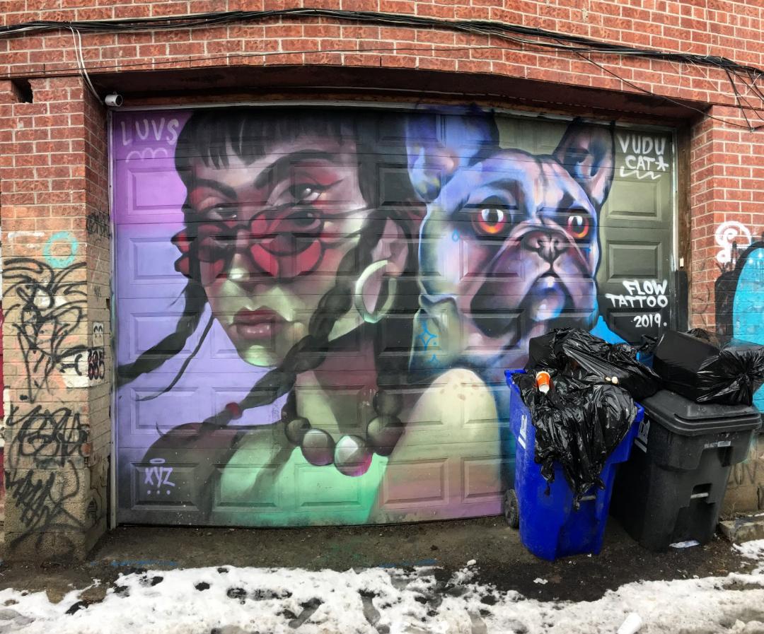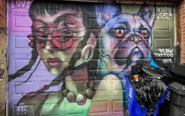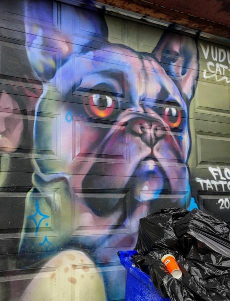 Hi Resa, why…oh why do folks have to obscure these artworks with dumpsters? It make it look like the doggy is raiding the bins for food. I think that is a French Bulldog(?) and it reminds me of the late Carrie Fisher’s dog that she called Gary (Fisher)!