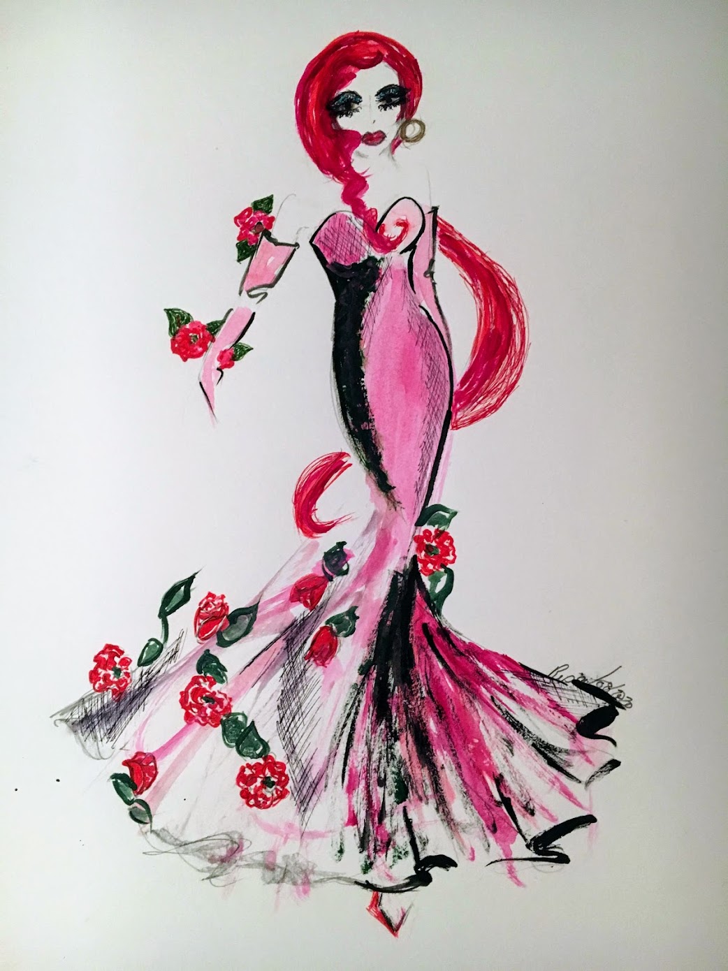 Above is RR in a net and roses gown. Below is a slideshow with a mere smattering of all the drawings of Holly characters I’ve had so much fun with.