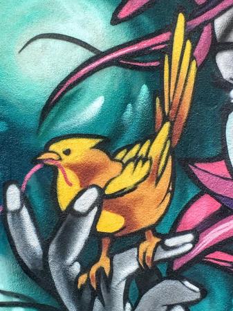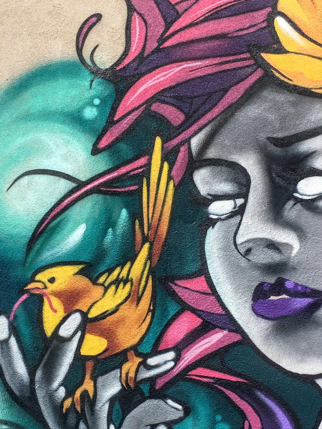 Have you ever considered coming back to Vancouver! Just a thought Resa. You know that Vancouver has never been the same since you left. The Vancouver Mural Festival is coming in August – wouldn’t it be fun to roam all over Vancouver to find murals. (P.S. Vancouver misses you.) She is beautiful and the yellow bird has a marvelous symbolism of joyful happiness.