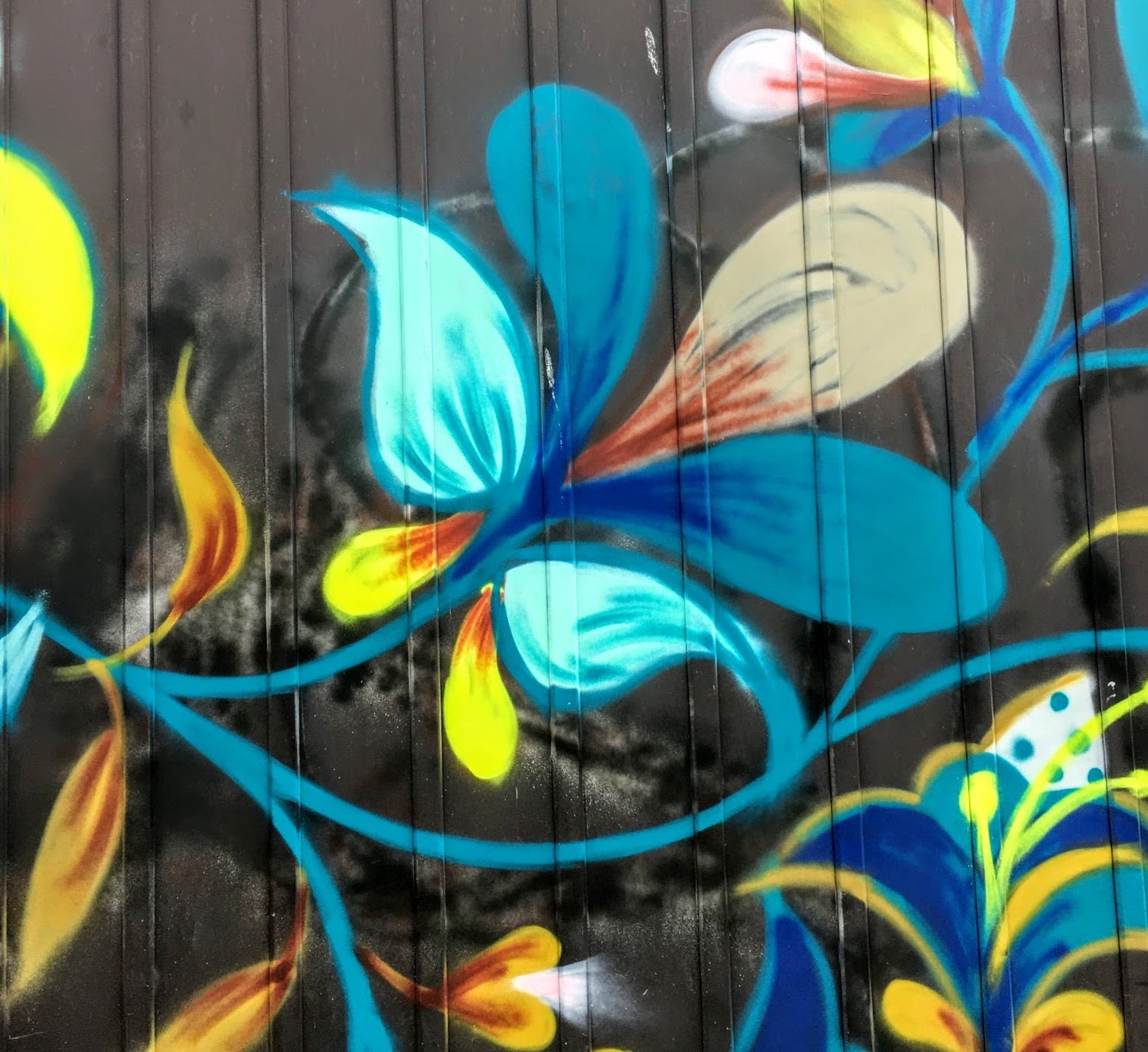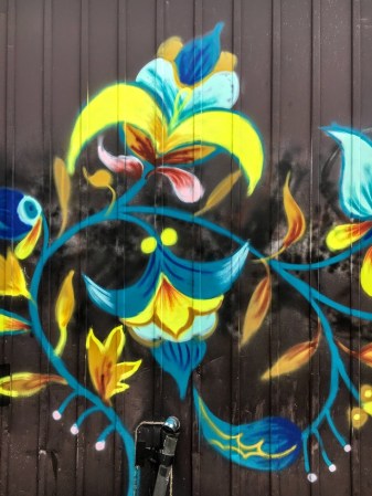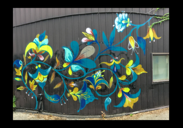 I was 10 poems into the book. Then, on one of my street art hunts, I came upon this mini-mural. There is a constant flowing of blue, with abstract flowers and leaves. I thought, this is like Merril’s book.