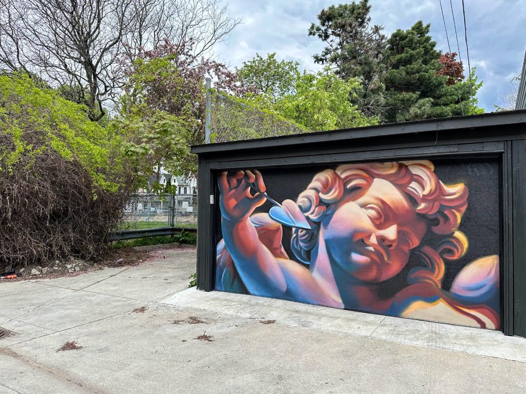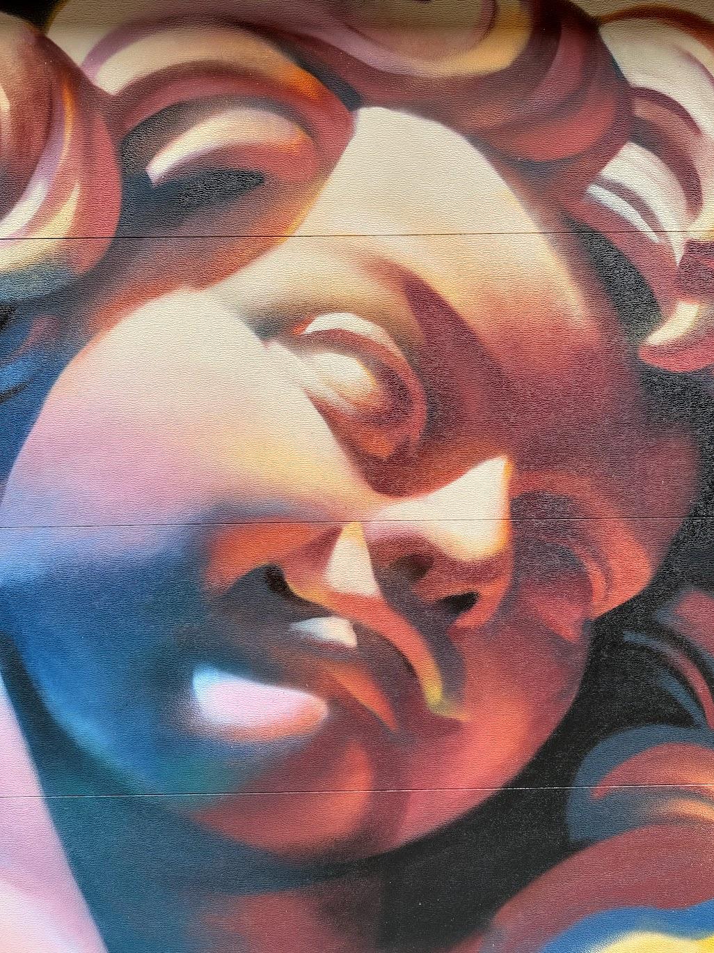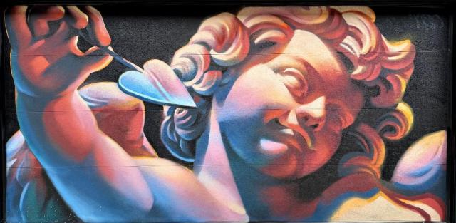 I love the mural! This is the least-creepy cherub I’ve ever seen. I also really like how three-dimentional the mural is.