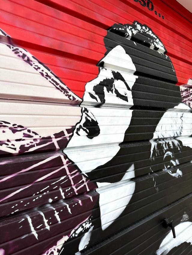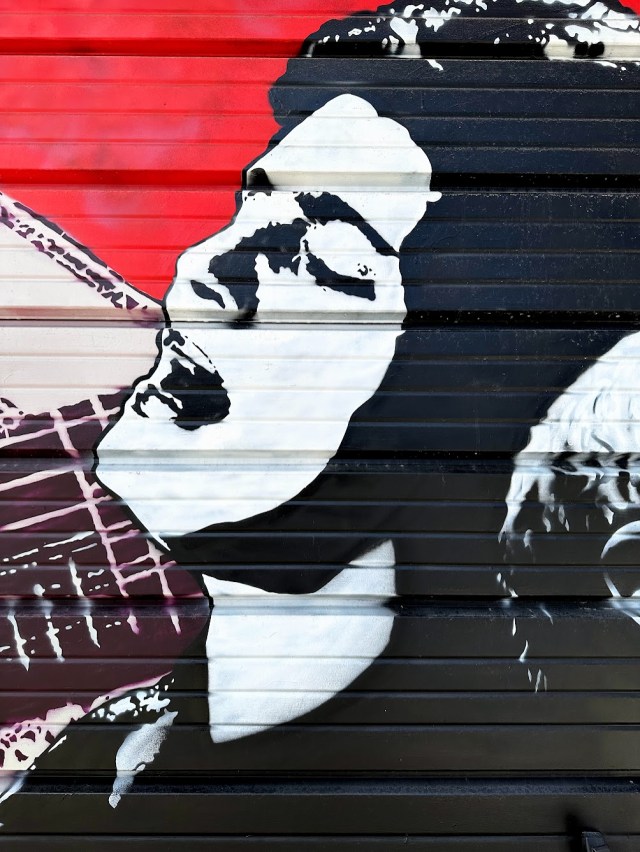The stencil art on this garage door features 2 of the greatest Fado singers, Amalia Rodriguez and Mariza.