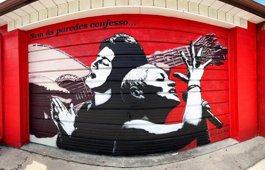 The stencil art on this garage door features 2 of the greatest Fado singers, Amalia Rodriguez and Mariza.