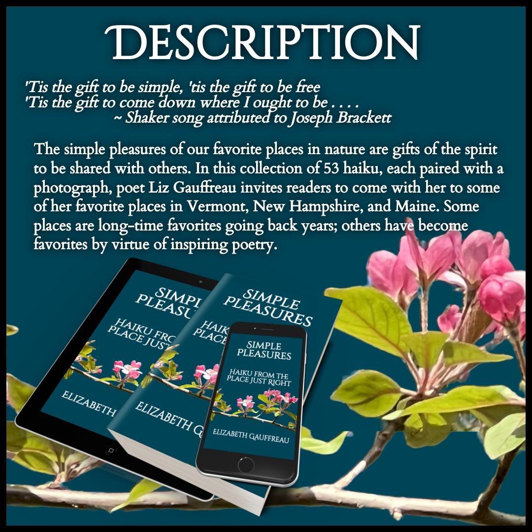 Liz –Thank you, Resa, for hosting me for the final day of my blog tour for Simple Pleasures: Haiku from the Place Just Right!