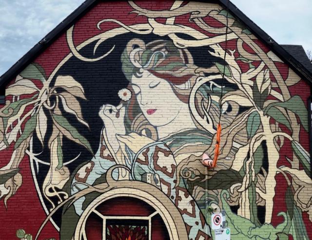 Resa – The quadriptych was painted indoors on canvas. They were coated and moved outdoors onto an alley wall of a dance school.