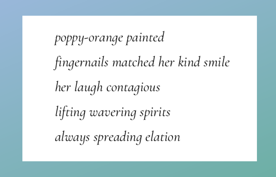 Lavender, salmon, watermelon, pale green, turquoise, gold, corals, pink, lemon yellow and blue are all in the poet’s word palette.