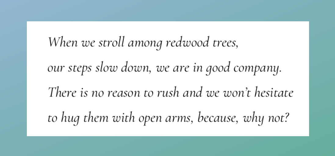 Resa – You hug redwood trees, and thank them with reverence. More, they impart peace, a wisdom and joy unto you.