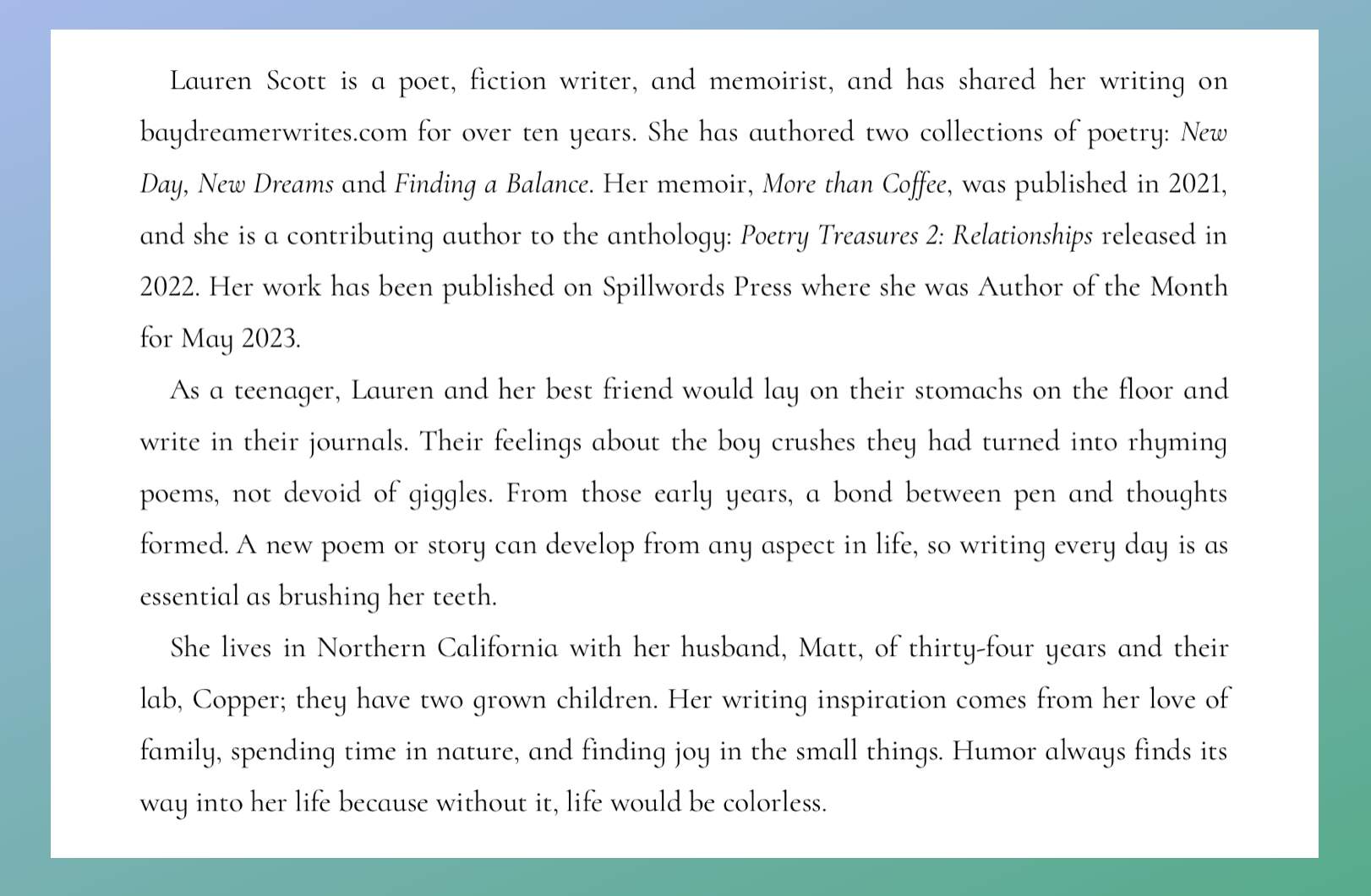Click on the cover of “Ever So Gently”to buy it on Amazon. Click on the cover of “More Than Coffee” to but it on KOBO. Both venues carry both books, as well as Lauren’s other 2 books: “Finding a Balance” – “New Day New Dreams”