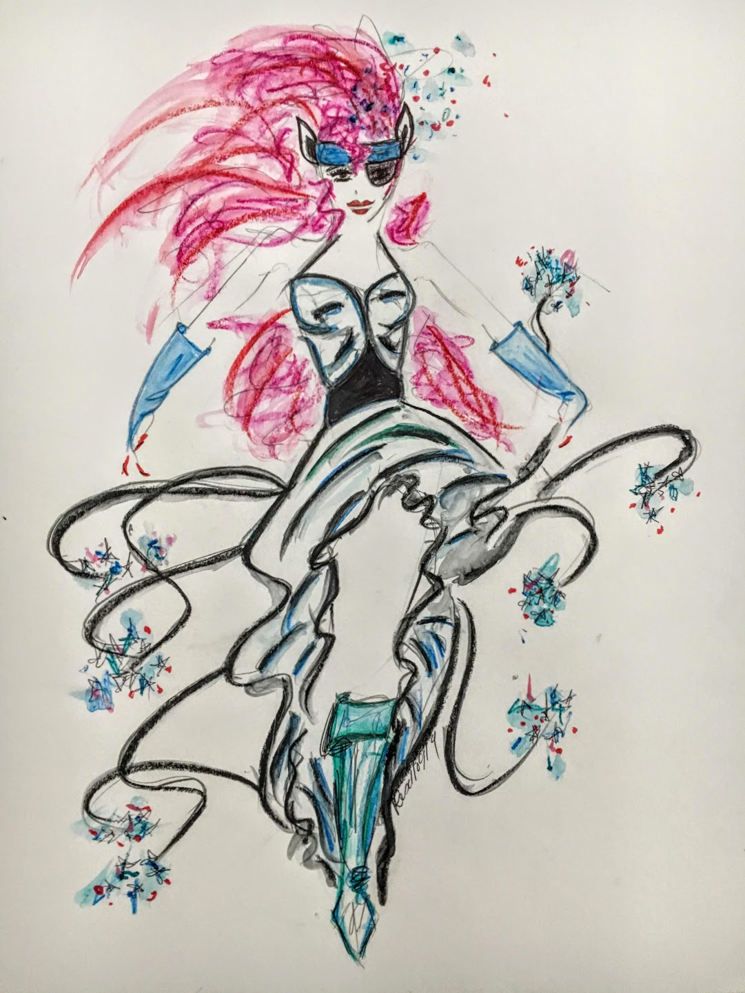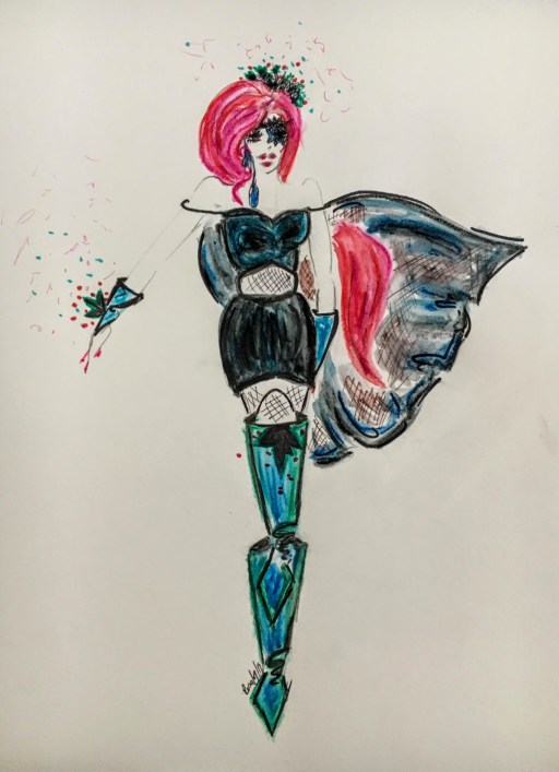 It all began with Crazy Free Art to music. I wanted to draw PBH, but she already has an outfit. I went renegade, & just did what I felt like. It’s scribbly, but we thought this could be an outfit to avenge Eco Crimes, Monsanto specifically!
