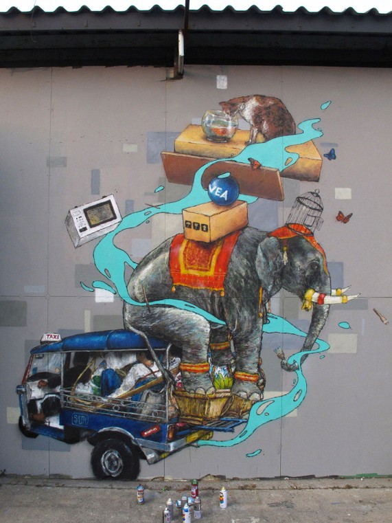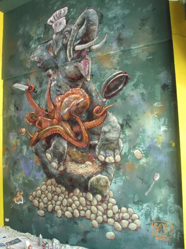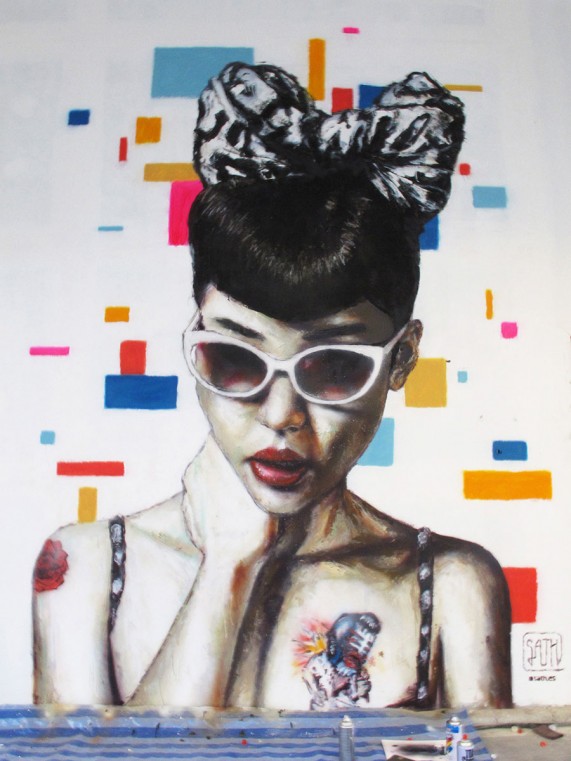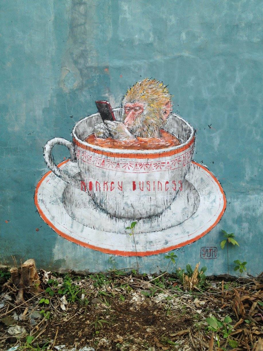 Two recent pieces Sath has done are collaborations with SIK. Above is Crow-n. I absolutely adore it. Below is a 21 second video of a mural with a big message about “the orangutans, the palm oil industry and the deforestation”