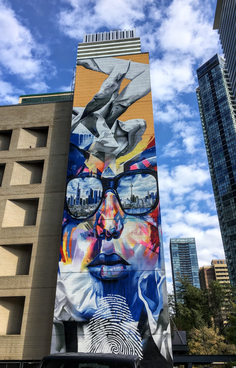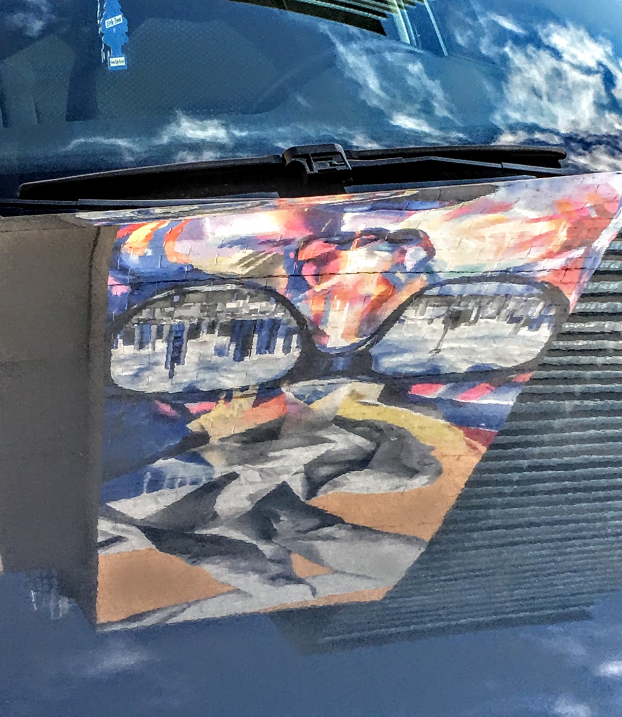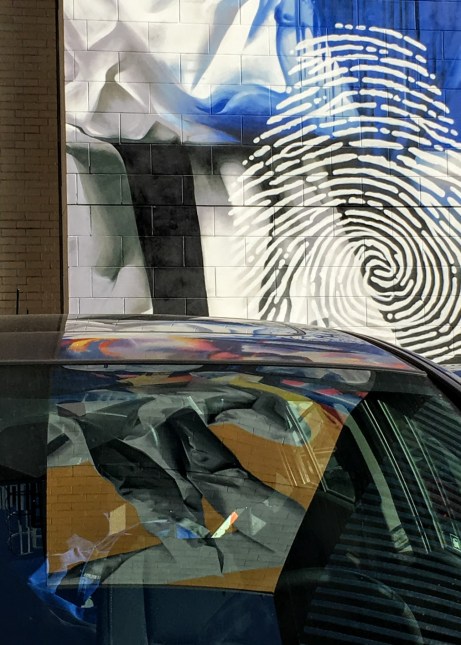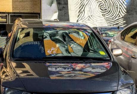 It faces a parking lot. The car reflections come from quite high up, so sometimes are not as crisp, as usual.