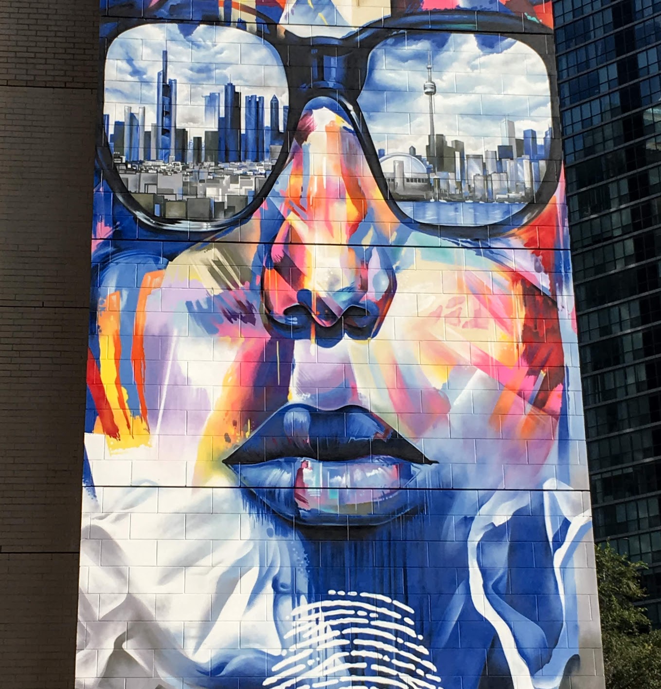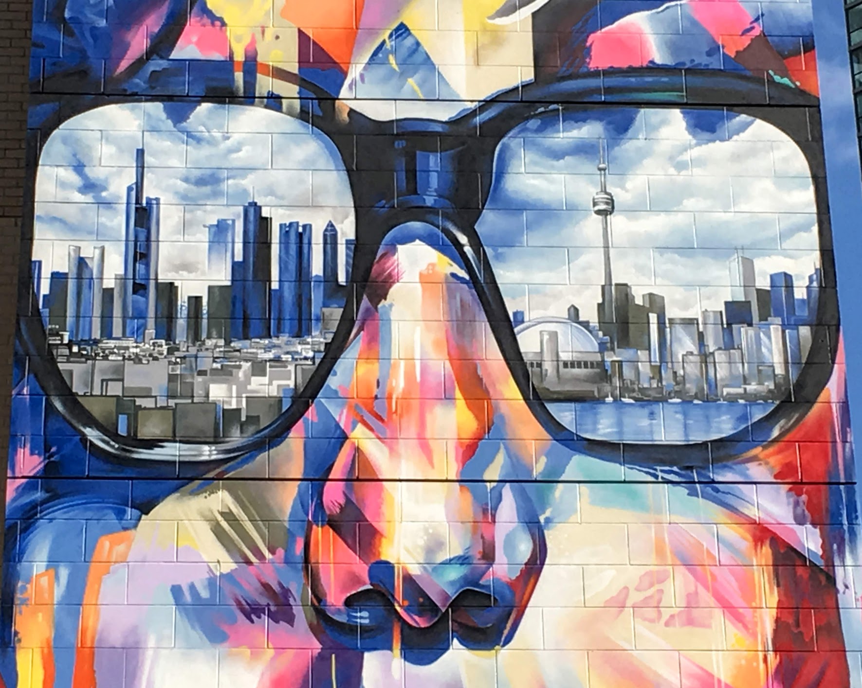 The reflected skyline view in the sunglasses seems reasonably correct. However, one lens is from the lake view, and the other from the land view.