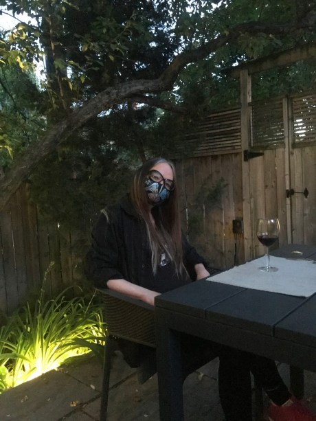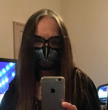 I’ve decided to grow out my grey hair. That thing in the centre of my chest is a bottle of hand sanitizer on a lanyard. I wear OS men’s shirts as a form of PPE. I hand painted my mask.