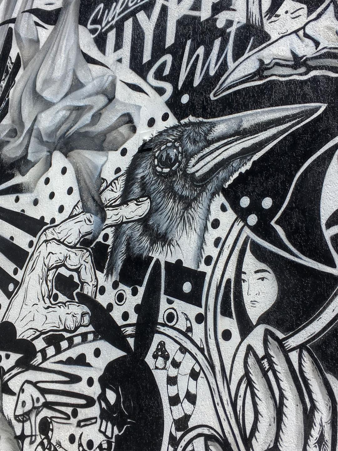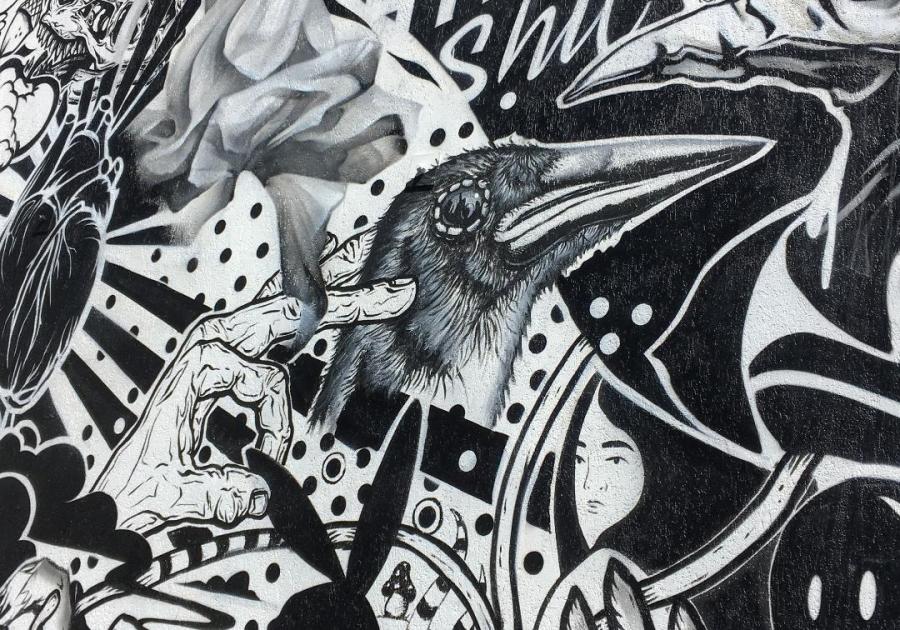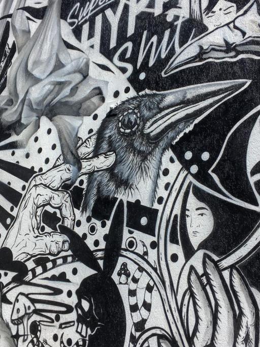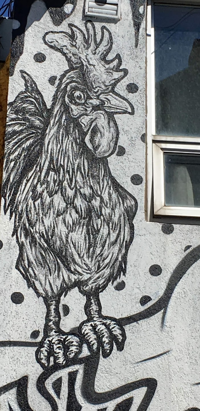 Why does that fish have a peacock feather tail?” She asked as he sprayed more paint onto the wall.