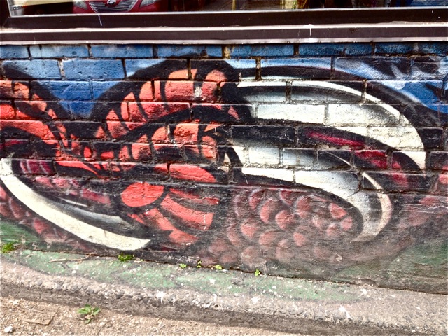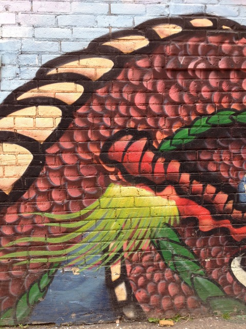 The beautiful face above is the centre of a long (about 75′) low-lying mural.