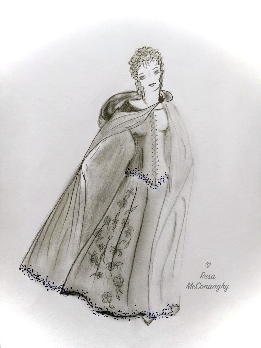 Resa – I imagined 2 gowns, as the story proceeded. One is her original black gown, with the addition of shoes and a sweater (scripted). The gown is now torn from horse riding through battles, the sweater disheveled.