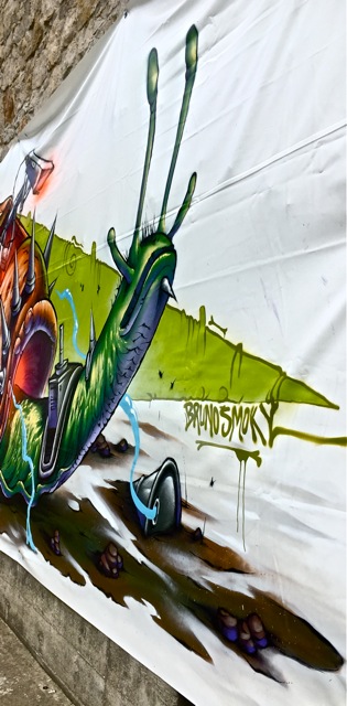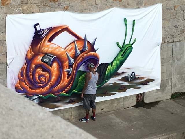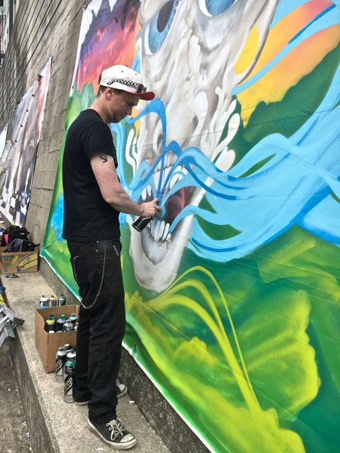 “FESTIVAL” was his second piece, & completed on the 2nd day. The piece he began on the 1st day was cut in half by hooligans during the night. They were caught & slept in jail.